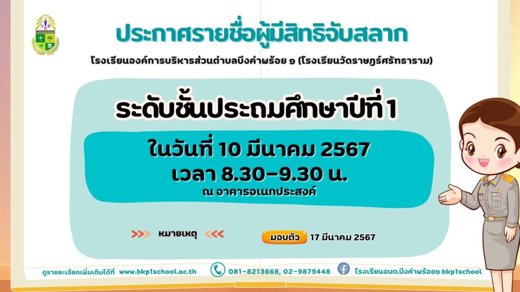 ประกาศรายชื่อ ผู้มีสิทธิจับสลากระดับชั้นประถมศึกษาปีที่1 ปีการศึกษา 2567