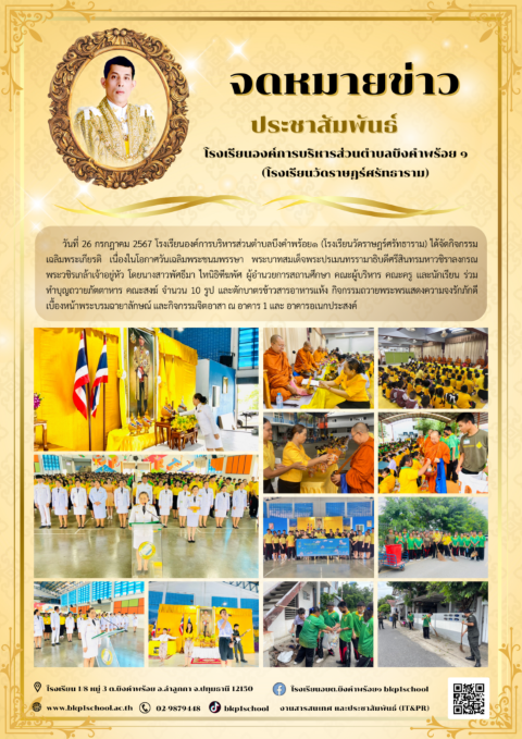 วันที่ 26 กรกฎาคม 2567 โรงเรียนองค์การบริหารส่วนตำบลบึงคำพร้อย๑ (โรงเรียนวัดราษฎร์ศรัทธาราม) ได้จัดกิจกรรมเฉลิมพระเกียรติ เนื่องในโอกาศวันเฉลิมพระชนมพรรษา พระบาทสมเด็จพระปรเมนทรรามาธิบดีศรีสินทรมหาวชิราลงกรณ พระวชิรเกล้าเจ้าอยู่หัว โดยนางสาวพัศธีมา ไทนิธิฑีฆพัศ ผู้อำนวยการสถานศึกษา คณะผู้บริหาร คณะครู และนักเรียน ร่วมทำบุญถวายภัตตาหาร คณะสงฆ์ จำนวน 10 รูป และตักบาตรข้าวสารอาหารแห้ง กิจกรรมถวายพระพรแสดงความจงรักภักดีเบื้องหน้าพระบรมฉายาลักษณ์ และกิจกรรมจิตอาสา ณ อาคาร 1 และ อาคารอเนกประสงค์