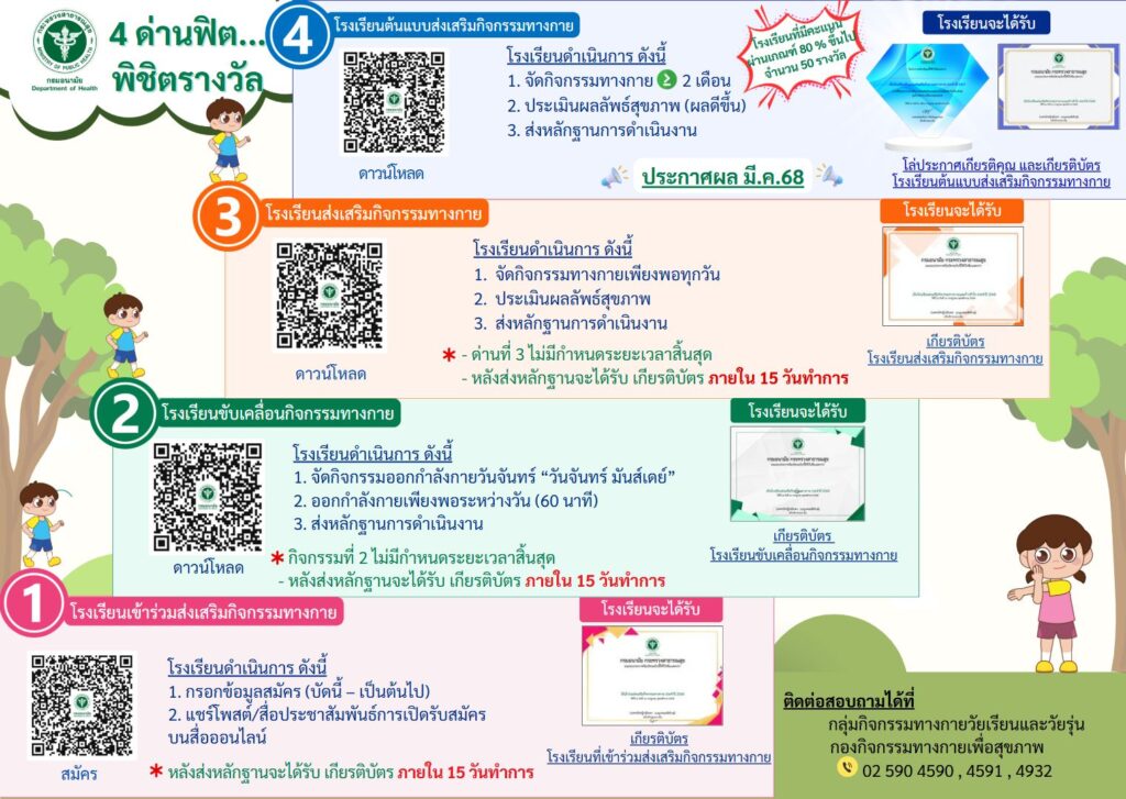 ปล.ขอสงวนสิทธิ์โรงเรียนที่เคยได้รางวัลจาก กองกิจกรรมทางกายเพื่อสุขภาพ กรมอนามัย ย้อนหลัง 3 ปี (2565-2567 ) ไม่สามารถขอรับรางวัลในด่านที่ 4 ในปี 2568 นะคะ