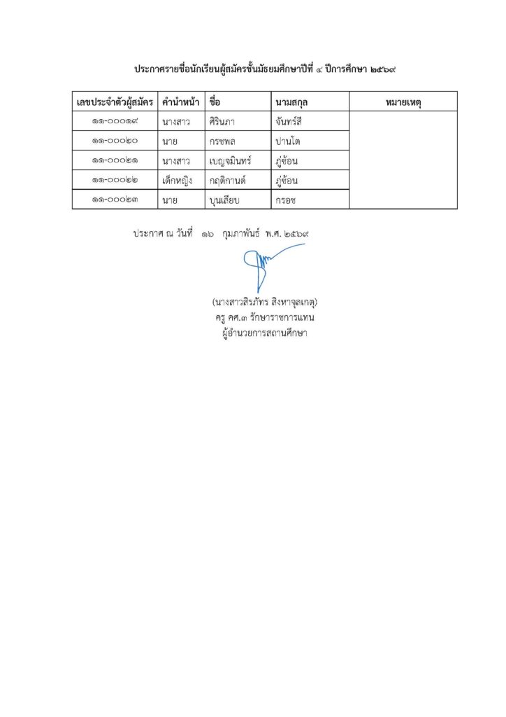 ประกาศรายชื่อนักเรียนผู้สมัครโควตาชั้นมัธยมศึกษาปีที่ 4