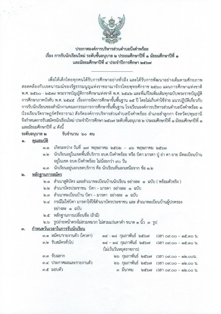 โรงเรียนองค์การบริหารส่วนตำบลบึงคำพร้อย ๑ (โรงเรียนวัดราษฎร์ศรัทธาราม) เปิดรับ สมัครนักเรียนใหม่ ปีการศึกษา 2567 โดยแบ่งเป็นระดับชั้น และช่วงเวลาตามกำหนด