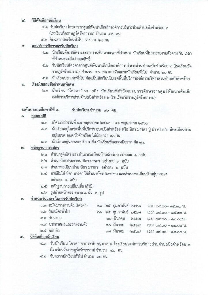 - รับนักเรียนโควตาจากศูนย์พัฒนาเด็กเล็กองค์การบริหารส่วนตำบลบึงคำพร้อย 2 (วัดราษฎร์ศรัทธาราม) จำนวน 40 คน และจับฉลากนักเรียนทั่วไป จำนวน 20 คน