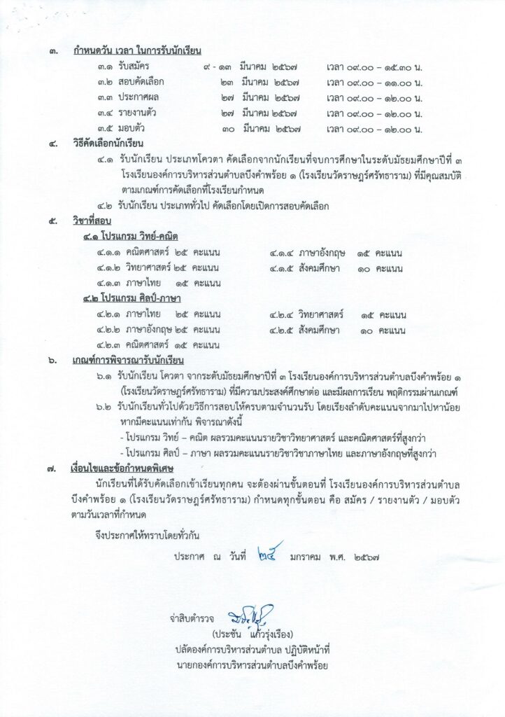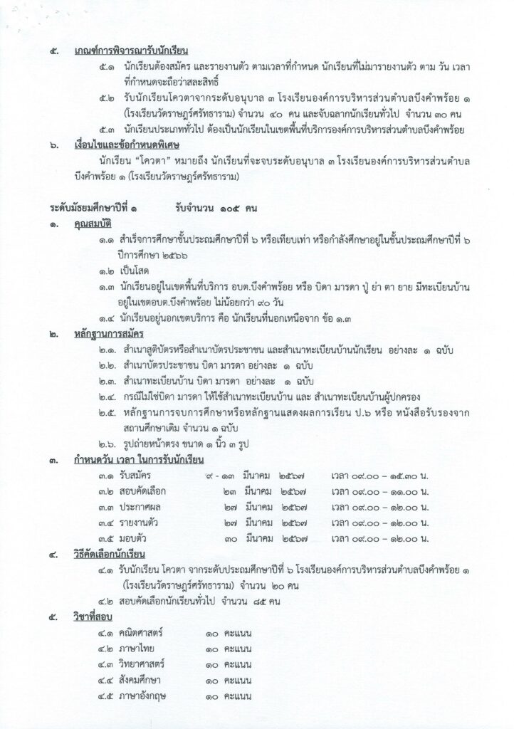 4.1 รับนักเรียน โควตา จากระดับประถมศึกษาปีที่ 6 โรงเรียนองค์การบริหารส่วนตำบลบึงคำพร้อย 1 (โรงเรียนวัดราษฎร์ศรัทธาราม) จำนวน 20 คน