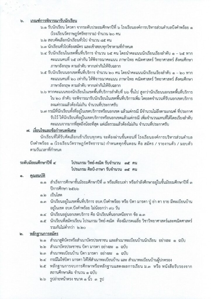 6.1 รับนักเรียน โควตา จากระดับมัธยมศึกษาปีที่ 3 โรงเรียนองค์การบริหารส่วนตำบลบึงคำพร้อย 1 (โรงเรียนวัดราษฎร์ศรัทธาราม) ที่มีความประสงค์ศึกษาต่อ และมีผลการเรียน พฤติกรรมผ่านเกณฑ์